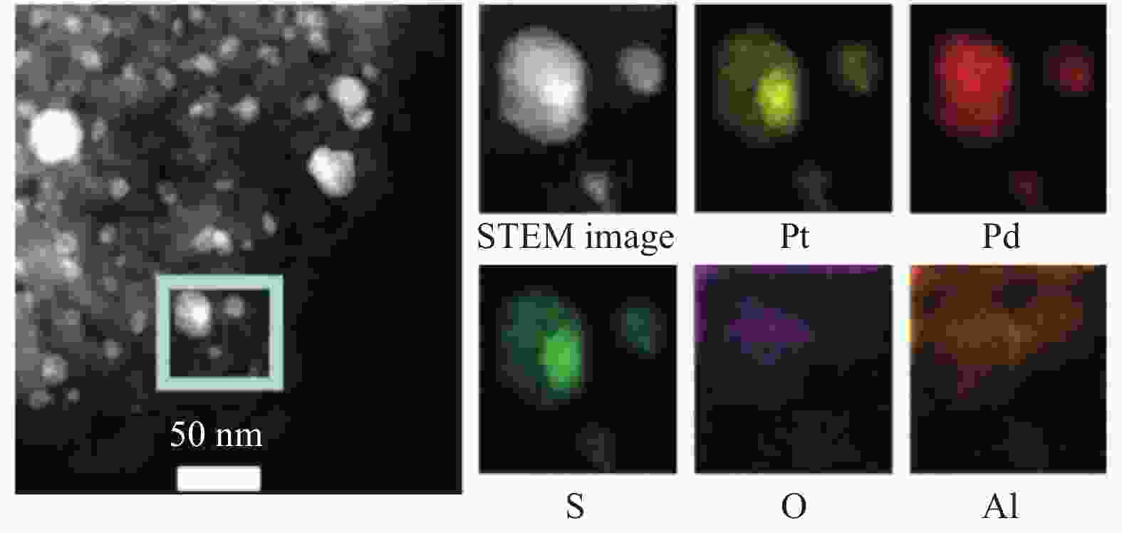 构建双贵金属催化体系能够提高催化剂催化燃烧的活性,Pt-Pd是较为常见的研究材料,得到了广泛的关注[45, 46]。在催化燃烧抗硫领域,也有一定的成果。表1汇总了近期文献中双贵金属抗硫性的相关信息。Corro等[47]研究了Pt-Pd/γ-Al2O3催化燃烧甲烷的抗硫性,XPS表征发现,Pt的存在减弱了催化剂表面Pd的硫酸盐的形成,Pt会优先吸附解离SO2,从而降低硫对Pd的影响。Sadokhina等[48]研究了双贵金属Pt-Pd/Al2O3的催化燃烧甲烷的活性和抗硫性,并与单一的Pd/Al2O3作对比。实验发现,添加Pt后能改善催化氧化的活性,其原因是Pt-Pd合金的形成,提升了催化效能。500 ℃下,在含有0.001%的SO2气氛中,单一贵金属Pd的催化转化率1 h内从87%下降到10%,双金属缓慢下降到66%。EDX谱图测试发现,SO2氧化生成的硫酸盐会在Pt颗粒周围聚集(如图1),从而保护了Pd主活性物质。