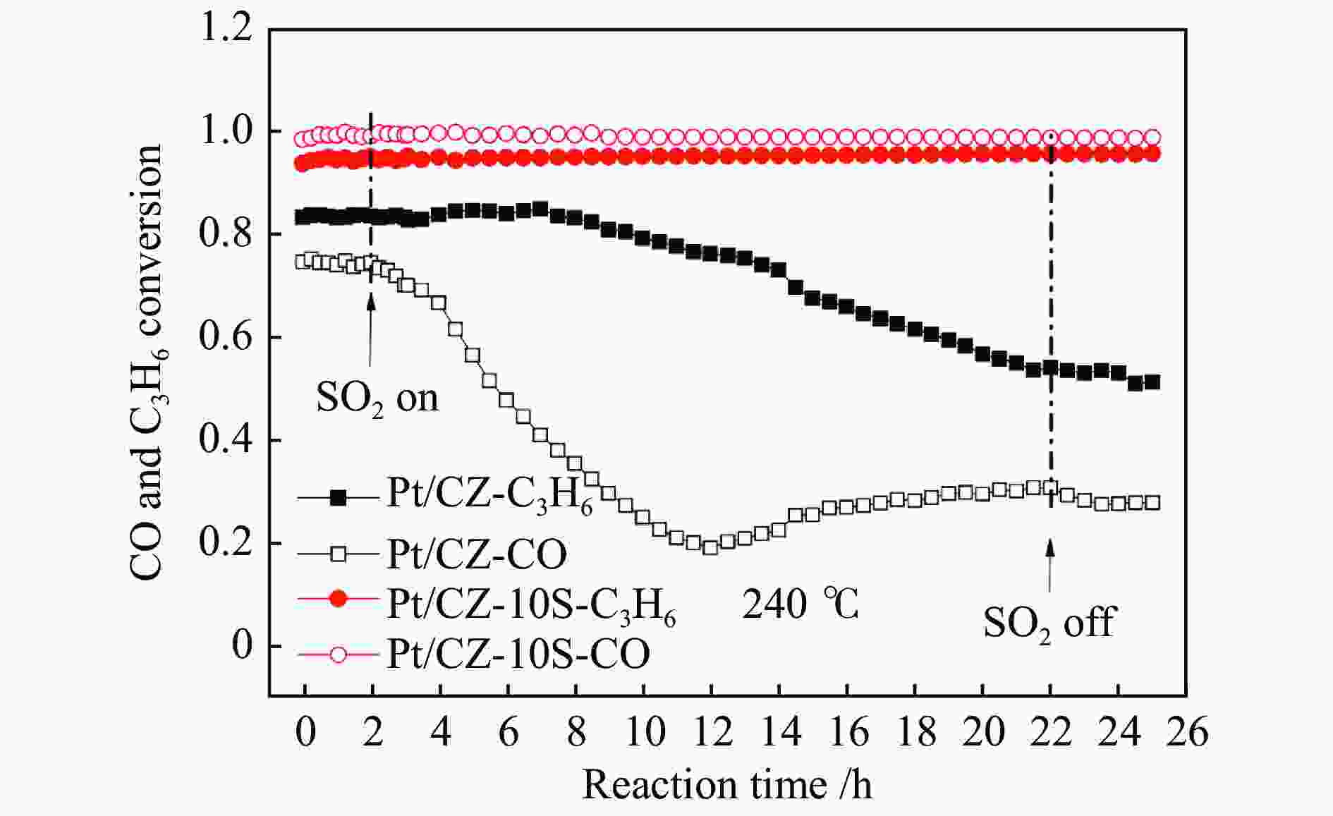 SO2是一种酸性气体,会吸附在催化剂的载体碱性位上,因此,可以通过载体的改性来提高催化剂的酸性来抑制SO2的吸附。杨铮铮等[58]采用浸渍法制备了不同含量SiO2改性的Al2O3材料,以此作为载体制备一系列Pt/SiO2-Al2O3柴油车尾气净化催化剂,在300 ℃下,用含有0.05%的SO2的模拟气处理催化剂3 h,热重法硫积累实验显示,硫物种在催化剂表面沉积会趋于饱和,经过改性的催化剂,其硫物质的积累量均低于1%。SEM发现SiO2均匀地沉积分布在Al2O3表面,而SiO2是一种酸性载体,较难与硫的氧化物反应生成硫酸盐,从而减弱了SO2对催化剂的影响。Gu等[59]采用湿法浸渍法对CeZr载体进行了硫酸化预处理,制备了载体硫酸化的Pt/Ce-Zr-SO2− 4柴油车尾气催化剂,实验发现适量硫酸根的引入提升了催化活性(如图2),且在反应气氛中掺入0.02%的SO2,在240 ℃下催化氧化CO和C3H6连续反应20 h,其转化率一直高于95%(如图3)。NH3-TPD表征发现,载体硫酸化后显著提升了催化剂的表面酸性,从而抑制了SO2在催化剂的表面吸附,以此提升了抗硫性。Valechha等[60]采用溶胶凝胶法制备了不同含量Zr取代Ce的Au/CeZr催化剂,在含有0.001%的SO2气氛中催化氧化CO的稳定性实验中发现,Zr的掺杂显著提高了催化剂的反应稳定性,即使在含SO2的气氛中暴露5 h后,活性仍保持恒定,且再生性能良好。Ding等[61]制备了单一Ce载体和CeZr载体负载的Pd催化剂,在含有0.01%的SO2气氛中预处理6 h,Pd/CeZr催化燃烧甲烷的活性在一定程度上得到了提升,且在含有0.001% SO2的气氛中连续反应50 h,也可以维持活性。XPS、NH3-TPD表征显示,经过SO2反应后,Pd/CeZr表面氧空位增多,表面酸性得到提升,可以避免硫酸盐的进一步沉积。
