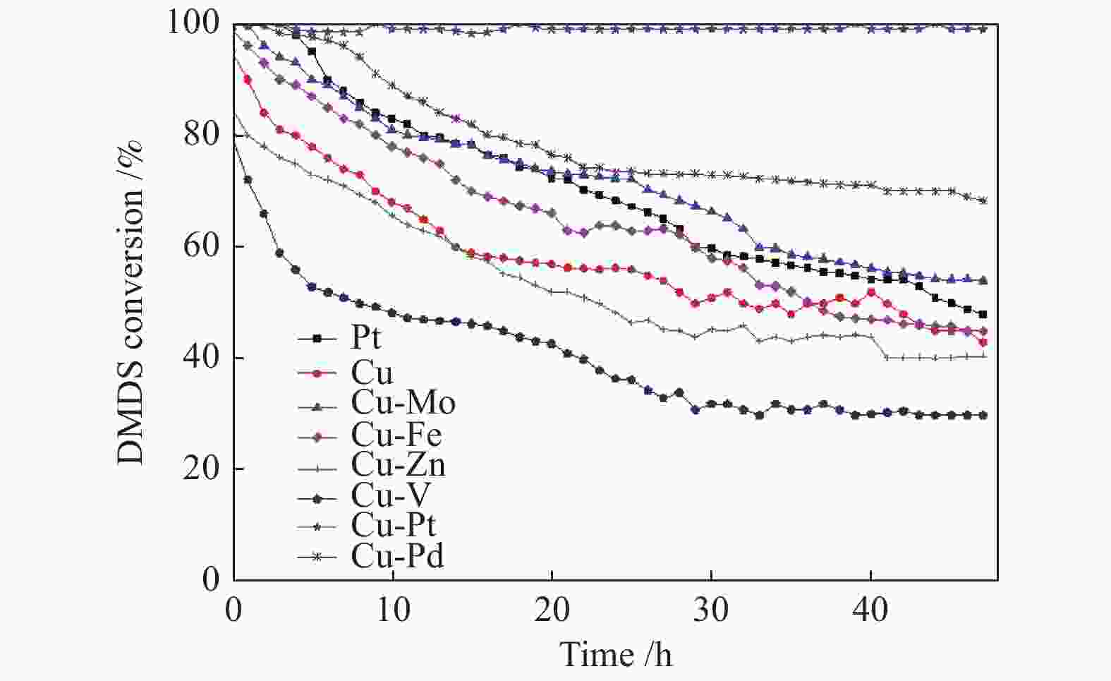 此外,也有研究利用双金属的协同作用来达到抗有机硫的目的。Gao等[77]研究了双金属催化剂对DMDS的催化燃烧,探究了其双金属间的相互作用和抗硫性。实验证明,Cu/γ-Al2O3-CeO2催化活性最佳,在掺入Pt后,活性得到提升。在 300 ℃,含0.1% DMDS的气氛中48 h稳定性测试中, Pt-Cu/γ-Al2O3-CeO2一直保持着活性不变,而其他催化剂迅速失活(如图6)。上述双金属催化剂活性和抗硫性的提高主要因为Pt和Cu的相互作用以及Cu的存在能够促进硫氧化物的氧化与解吸。