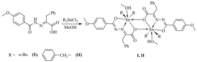 Diorganotin 2-(2-(4-methoxybenzoyl)hydrazono)-3-phenylpropanoic carboxylate complexes I {[p-CH3O-C6H4O(O)C=N-N=C(PhCH2)COO](n-Bu)2Sn(CH3OH)}2 and II {[p-CH3O-C6H4O(O)C=N-N=C(PhCH2)COO](PhCH2)2Sn(CH3OH)}2 have been synthesized. The complexes have been characterized by IR, 1H, 13C and 119Sn NMR spectra, HRMS, elemental analysis, thermal stability analysis and the crystal structures have been determined by X-ray diffraction. The crystal of complex I belongs to triclinic system, space group P