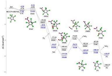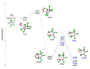 Hexachlorocyclopentadiene (HCCP) is one of the chlorinated and highly reactive pollutants, which can be released into the atmosphere and undergo chemical transformations. In this paper, the initiated reaction mechanisms of HCCP with typical atmospheric oxidants (•NO3, •HO2, •OH, and O3) were theoretically investigated. The results mean that all initiated reactions are exothermic, and the energy barriers do not exceed 16 kcal⋅mol-1. The rate constants of HCCP reaction triggered by •NO3, •HO2, •OH, and O3 are 2.49 × 10-12, 2.44 × 10-22, 2.46 × 10-13 and 1.33 × 10-20 cm3⋅molecule-1⋅s-1 at 298 K, respectively. It can be concluded that the reaction of •NO3 and •OH with HCCP more likely occurs according to the rate constants. Then the subsequent reactions of the •NO3/•OH-initiated intermediates with O2 and NO were calculated, resulting in that the cyclopentadiene is ruptured completely. And the results show that the Criegee intermediates created in the ozonization reactions of HCCP can react with O2, NO2 and SO2. This study gives more insight into the chemical transformation mechanisms of HCCP in the atmosphere.