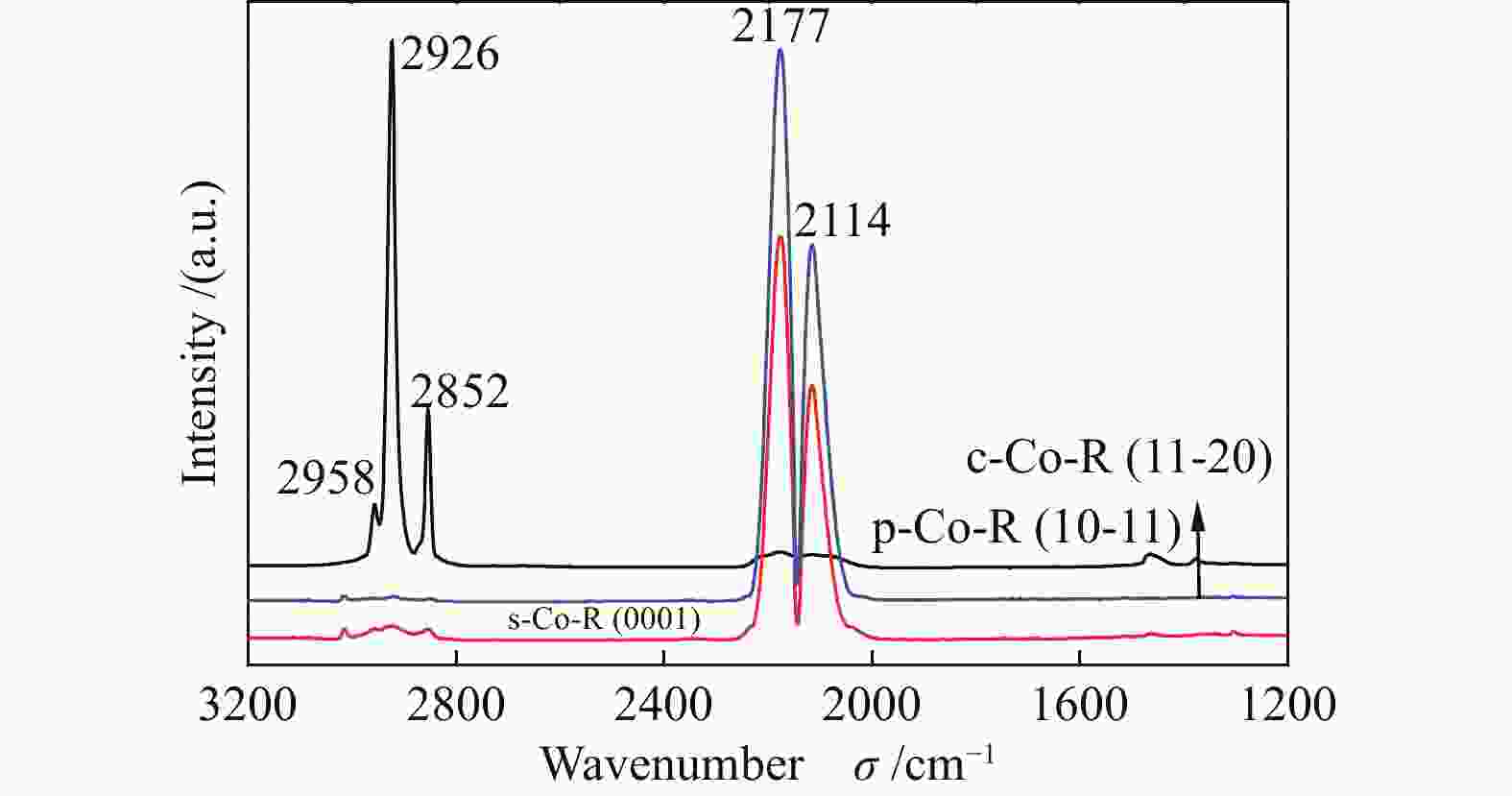 对以上三种不同晶面Co催化剂进行原位红外光谱分析,如图10所示。所有催化剂均在波数2114 cm−1处,出现了一对明显吸收峰,归属为气相CO的吸收峰,值得注意的是吸收峰的强度有所不同。p-Co-R催化剂在2852、2926和2958 cm−1处出现明显CHx吸收峰,其中,2852、2926 cm−1处的峰归属于CH2物种,2958 cm−1处的峰归属于CH3物种。以上原位漫反射红外光谱结果说明,在该催化剂上CO解离生成的碳物种大量加氢生成CHx,进一步证明了在p-Co-R催化剂上CO解离加氢能力较强。文献报道[33,34],CO解离生成的CHx中间体更容易加氢生成CH4,而不是与非解离CO反应,这与p-Co-R正向CTKA过程中CH4表现出很大的生成速率也是一致的。s-Co-R催化剂在2852、2926和2958 cm−1处的吸收峰强度很弱,表明在s-Co-R催化剂上CO解离加氢生成少量CH2、CH3,大部分是CO的气相双峰(2114、2177 cm−1),结合原位拉曼实验可知,s-Co-R催化剂上CO大量解离为积炭,少量碳物种氢化为CHx。c-Co-R催化剂在2852、2926和2958 cm−1处的CHx吸收峰几乎没有,表明在c-Co-R催化剂上CO解离加氢生成微量CHx。