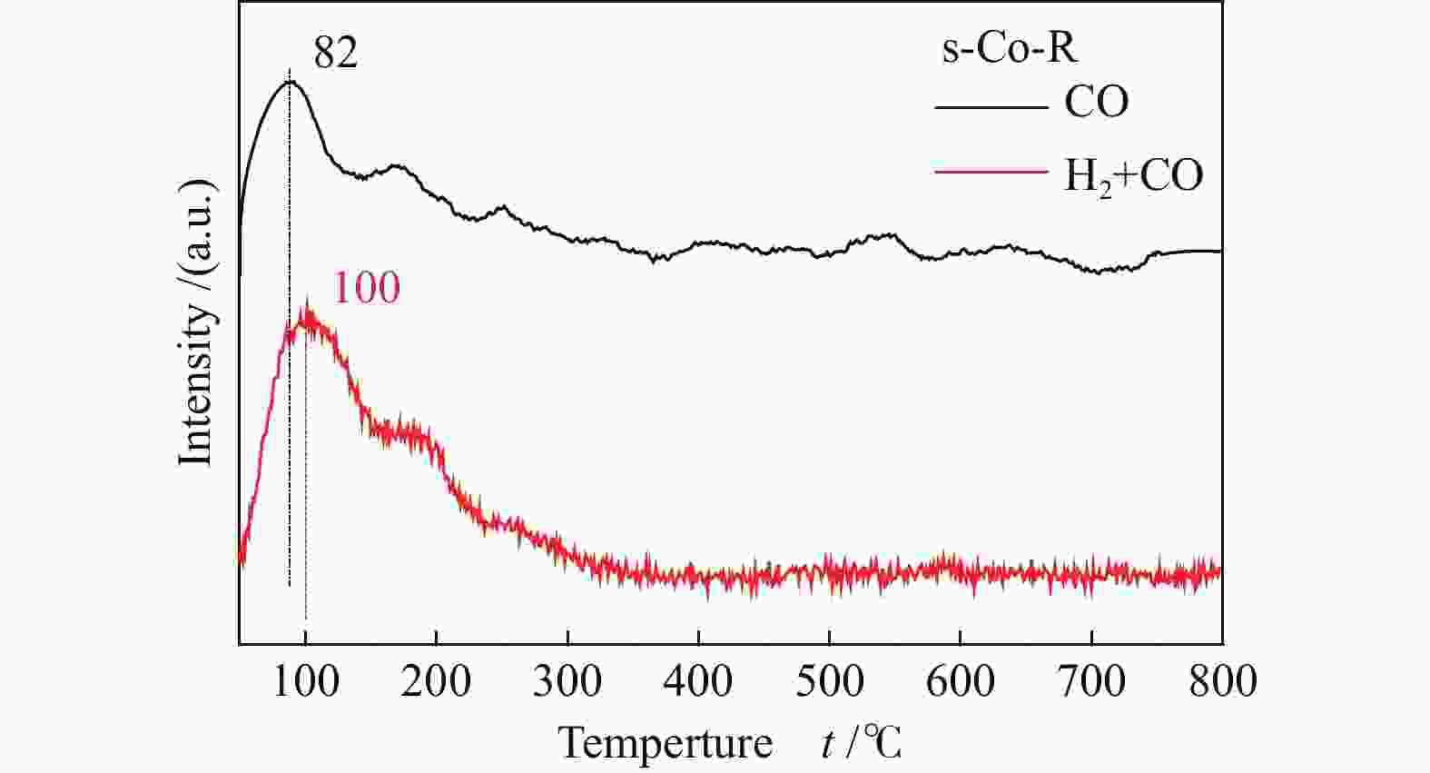 图2显示了s-Co-R催化剂的CO/(H2+CO)-TPD中CO的脱附信号。对于s-Co-R来说,与仅吸附CO相比,预吸附H2然后吸附CO时脱附温度向高温方向偏移(82 vs 100 ℃),且脱附峰面积增加。表明预吸附氢的存在增强了CO与金属活性位点的相互作用,导致CO在s-Co-R催化剂上的低温吸附性能增强。CO−金属键的结合能力增强,C−O键相应地减弱[21],进一步促进了CO的解离和活化。因此,预吸附氢促进了s-Co-R催化剂上CO的解离,表明CO在s-Co-R催化剂上倾向于氢助解离。此外,理论计算表明[24,25],CO在平坦位点容易发生氢助解离,也进一步证明了在平面状(0001)晶面的s-Co-R催化剂上CO倾向于以氢助解离的方式进行活化。
