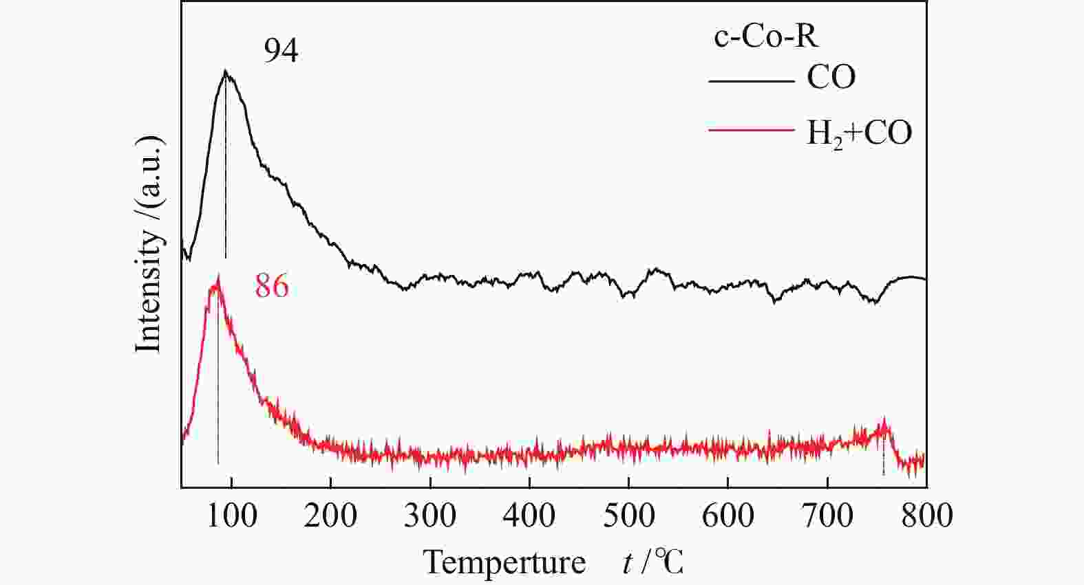 程序升温脱附是提供CO吸附解离相关信息的重要工具[21],同时也能了解CO与金属催化剂之间的相互作用。图1显示了p-Co-R催化剂的CO/(H2+CO)-TPD中CO的脱附信号。对于p-Co-R催化剂来说,与仅吸附CO的脱附峰相比,当催化剂预吸附H2然后吸附CO时脱附温度降低(77 vs 70 ℃),表明预吸附氢减弱了CO与Co粒子表面的结合能力[22],需要的脱附活化能变低,抑制了p-Co-R催化剂上的CO吸附。CO-金属键的结合能力减弱,吸附的CO中C−O键的强度增强,所以预吸附氢也抑制了p-Co-R催化剂上CO的解离。因此,CO在台阶状(10-11)晶面的p-Co-R催化剂上倾向于直接解离而不是氢助解离,这与文献中理论计算[7,23]结果相一致。