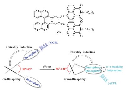 由联二萘酚的轴手性所构筑的手性分子不仅在溶液中呈现出圆偏振发光性质, 此类分子的聚集态同样具有圆偏振发光性质, 甚至还可以实现CPL信号有无、强弱以及信号反转的调控. 如图 13所示, 成义祥课题 组 [34] 合成了一个基于联萘基的手性萘酰亚胺衍生物26, 并发现其也具有聚集诱导发光性质, 并且它从稀溶液(R-26: -6.1×10-3; S-26: 5.5×10-3)到聚集态(R-26: 2.8×10-3; S-26: -2.2×10-3)显示出正负相反的CPL信号. 这是由于分子26从THF稀溶液中的顺式构象转变为在THF/水混合溶液中的反式构象导致联萘单元的二面角不同所产生的.