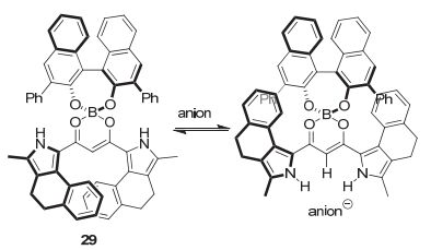 Maeda课题组 [36] 于2011年报道了首例CPL信号的化学刺激响应. 如图 15所示, 他们将BINOL单体引入二吡咯二酮得到阴离子响应的π共轭分子29, 其中阴离子与29相互作用导致两个吡咯环的反转, 引起的构象改变可以调控阴离子捕获器的光手性性质. 化合物29本身检测不到明显的CPL信号, 但当29与氯离子或乙酸根离子络合后, 表现出明显的CPL信号, 其glum可达2×10-3. 通过阴离子的刺激可诱导增强其CPL信号, 此策略为CPL的强度调控提供了一种新的方案.