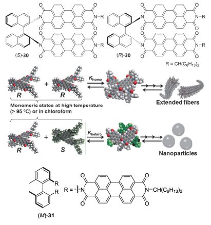 不仅联二萘酚有CPL性质, 如果在联二芳基的2, 2'位引入大位阻的荧光基团, 也可以得到具有CPL性质的手性有机分子. 如图 16所示, 通过连接两个苝酰亚胺基团到手性联二萘骨架上可得到具有显著CPL性质的手性有机发光分子30. 在氯仿溶液中其量子产率高达88%, |glum|在550 nm为0.003. 30也是目前同时具有高荧光量子产率和高不对称因子的一个最优CPL有机小分子 [14] . 该分子不仅在稀溶液中具有显著的CPL性质, 其聚集组装体同样具有CPL性质. 该分子组装形成的一维纳米纤维的不对称因子为0.02, 远高于其在氯仿溶液中的结果. 而且聚集体的形貌对圆偏振发光的程度起关键作用. 随着对映体过量的不同, 一维纳米线的长度逐渐减小, 直至最后其外消旋体组装形成规整的零维纳米球, 相应的CPL信号随着纳米线长度的减小而不断减弱 [37] . 类似地, 在联二苯基上引入苝酰亚胺同样可以诱导产生CPL性质, 因此, Langhals等 [38] 基于二氨基联苯与苝酰亚胺合成了一个含双发色团手性荧光染料(M)-31, 发现该分子同时具有高量子产率和显著的CPL性质.