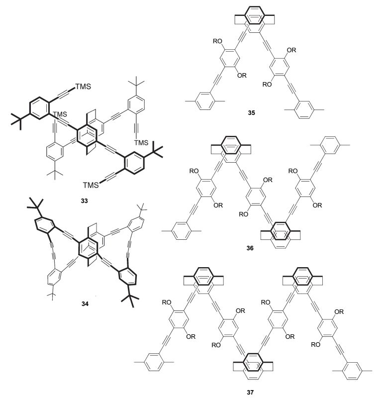 相对于中心手性与轴手性分子, 面手性有机分子结构更为刚性, 由其形成的具有CPL性质的手性有机小分子可能显示更大的不对称因子. 如图 18所示, Morisaki等 [40] 合成了基于D2对称的 [2, 2] 对环芳烷的CPL有机小分子33和34. 螺旋桨式的结构使得 [2, 2] 对环芳烷34不仅具有良好的不对称因子(glum=-0.011), 也具有高的量子产率(Φ=45%). 有趣的是, 34的glum值是其前体33 (glum=+0.0011)的10倍. 化合物34良好的CPL性质源自于其独特的结构, 其中存在一个内在的D2对称性, 并且具有十字交叉状高度离域的荧光团. 因此, 尽管π共轭荧光团平面被扭曲, 可能会导致其量子产率降低, 但是 [2, 2] 对环芳烷中心允许一种有效的贯穿空间的电子作用, 使得电子离域于整个分子, 这种额外的电子作用补偿了π共轭基团扭曲的影响, 从整体上提高了量子产率. 此外, 基于面手性[2.2]对环烷基骨架组成的光学活性寡聚体35~37 [41] , 其基态下低聚物的手性性质相似性归因于两个相邻发色团的等同取向; 而在激发态下, 通过光激发将低聚物折叠成类似于单手螺旋的形态, 使得这类分子在溶液中表现出强烈的圆偏振发光信号, 且具有相对大的不对称因子(10-2).