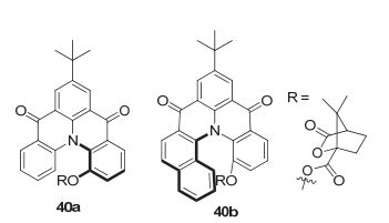 螺烯及其衍生物是一类由芳香环或其他非芳香环通过邻位稠合而得到的一类具有螺旋结构的芳香化合物 [43] . 这类芳香化合物末端芳环之间的空间位阻使分子骨架发生了扭曲从而不能处在同一个平面上. 这类分子既没有手性中心也没有对称面和S4反轴等对称元素, 扭曲的分子结构呈现出特殊的螺旋手性. 螺烯及其衍生物不仅呈现螺旋手性, 而且具有延展的π-共轭结构, 是一类优异的CPL分子体系. 如图 20所示, 2003年Venkataraman等 [44] 首次通过在外消旋的螺烯衍生物上引入手性辅助基团形成非对映异构体, 进而拆分得到具有CD和CPL性质的手性螺烯衍生物40a (glum=0.0011, λem=453 nm)和40b (glum=0.0007, λem=478 nm).