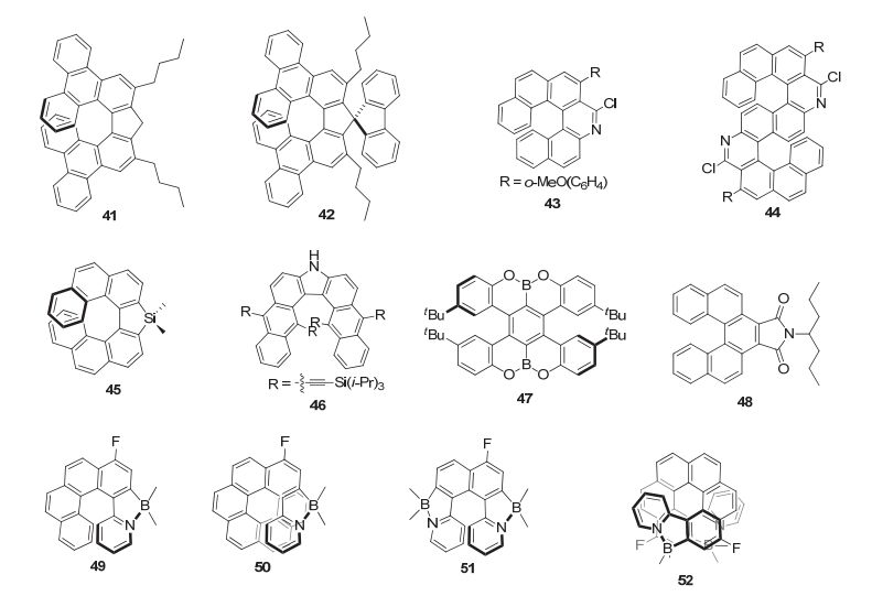 与碳碳双键相比, 硼氮双键具有一定的极性, 同样可以用来构筑具有CPL性质的螺烯类衍生物. 2017年, Crassous等 [51] 报道了四种硼氮杂[6]、[8]、[10]螺烯49~52, 分子中硼氮杂原子的引入使它们具有高的荧光量子产率(Φ=50%), 同时这类分子的对映异构体表现出显著的CD和CPL性质. 硼氮杂原子的引入可有效地改变这类杂螺烯分子的能级, 这可能使其成为良好的手性有机光电材料.