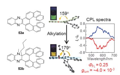 螺烯及其衍生物不仅具有良好的CPL性质, 而且通过骨架的改变及外部刺激响应等可以实现CPL性质的调控, 其中通过骨架的改变来调控手性螺烯衍生物的CPL性质是最直接的方法. 如图 22所示 [52] , 53a中喹喔啉片段与[7]螺烯片段之间的扭转角为159o, 其相应的绿色荧光的量子产率为0.05. 当53a烷基化后得到53b, 则喹喔啉片段与[7]螺烯几乎共平面. 由于部分去芳构化使得其发射黄色荧光, 量子产率增加到0.25. 更重要的是, 手性分子53b还表现出显著的圆偏振发光性质, 其不对称因子为4.0×10-3. 因此, 通过改变螺烯分子的骨架可便捷地实现手性发光性质的改变.