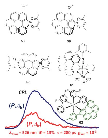 手性螺烯不仅可以实现常规的基于荧光发射的CPL, 还可用以构筑具有CPL性质的手性磷光分子体系. 所以当手性螺烯骨架上引入过渡金属铂(Pt), 铼(Re), 铱(Ir)等过渡金属, 可以很方便地得到具有圆偏振磷光性质的螺烯类衍生物. 如图 27所示, 手性螺烯骨架上引入过渡金属铂和铼后得到的手性分子58~61 [57] 不仅具有显著的磷光性质, 还具有CPL性质. 通过这种策略, 可以很方便地得到具有圆偏振磷光性质的螺烯类衍生物.