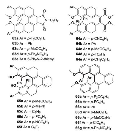 螺烯衍生物虽然可以方便地制得具有CPL性质的手性分子, 但是螺烯衍生物通常存在简单螺烯易于消旋、高级螺烯制备困难、以及发光效率偏低等问题. 为了解决这些问题, 如图 28所示, 最近我们课题组 [59] 通过在氢化[5]螺烯的1, 1'位引入两个甲基, 可以方便地得到不易消旋的手性螺旋骨架, 再通过引入内酰亚胺基团得到了一系列多官能团化的手性氢化[5]螺烯衍生物63a~63e. 由于这类分子具有显著的分子内推拉电子效应, 因此利用所引入芳基(Ar)的推拉电子能力不同, 成功地得到了一类具有全色CPL性质的手性分子 [60] . 随后, 我们把内酰亚胺换成吸电子能力较弱的酯基, 同时在1, 1'位引入更大位阻的苯基, 得到几乎不会消旋的分子64, 发现这类手性分子表现出优异的蓝光CPL性 质 [61] . 当吸电子片段换成苯基时, 我们得到的氢化螺烯衍生物65a~65f [62] , 不仅具有显著CPL性质, 其羟基的存在还可以实现对手性色氨酸甲酯的手性识别. 通过进一步芳构化我们还得到了1, 1'位含有不同大位阻基团的螺烯衍生物66a~66g [63] , 并发现其同样具有高的消旋能垒和显著CPL性质.