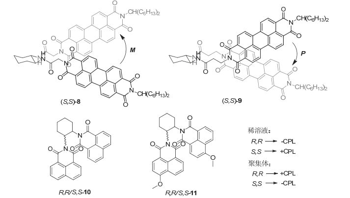 环己二胺作为一类中心手性分子, 将其引入发光团后同样可构筑具有CPL性质的手性发光分子. 如图 6所示, 当环己二胺通过不同长度柔性链引入两个苝酰亚胺后, 可得到具有不同构型的化合物8和9 [20] . 在稀溶液中, 单体分子8或9的CPL信号处于540 nm, 不对称因子glum(6×10-4)较低; 当浓度增大使8或9分子逐渐聚集后, 其聚集态的CPL信号处于630 nm, 且CPL信号反转, 不对称因子更高(glum=8×10-3). 基于类似的策略, 将1, 8-萘二甲酰亚胺引入到手性环己二胺骨架上可得到手性有机发光分子R, R/S, S-10和11 [21] . 由于这类分子具有相对刚性的骨架, 所以呈现出较高的发光效率和显著的圆偏振发光性质(R, R-2: glum=-10-2; S, S-2: glum=+10-2). 当此手性分子从稀溶液变成聚集体后, 其CPL信号发生了翻转(R, R-2: glum=+10-2; S, S-2: glum=-10-2), 这种由于分子聚集形态不同而导致CPL信号改变可应用于响应性CPL材料的研究.