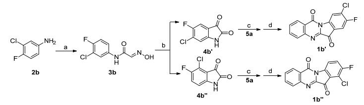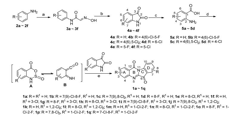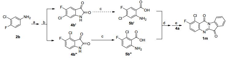The isatin derivatives 4a~4f were prepared and underwent oxidative hydrolysis to give the anthranilic acid 5a~5d. A and/or D-ring substituted tryptanthrins were designed and synthesized from 4a~4f to 5a~5d. Then C-ring Schiff bases of tryptanthrin were synthesized by condensation of 6-carbonyl with hydrazine and hydroxylamine hydrochloride. Finally, the B-ring was replaced with piperazine to give 11H-indeno[1, 2-b]quinoxalin-11-one. 20 compounds were synthesized and their structures were confirmed by 1H NMR, IR and elemental analysis. To best of our knowledge, 13 of them were unknown in the literature. The antitumor activities of synthesized compounds were evaluated against A549 cell line in vitro. The preliminary results indicated that 1b, 1c, 1i, 1j, 1p and 1q showed good antitumor activity with the IC50 of 3.58, 0.99, 1.03, 2.10, 0.51 and 0.43 μmol·L-1, respectively. Structure-activity relationship showed that halogen substitution located in the D-ring enhanced the anti-tumor activity, while the same substitution located in the A ring reduced the activity. The anti-tumor activity disappeared when B-ring was replaced by piperazine, while there was no significant difference for tryptanthrin and its C-ring Schiff base.