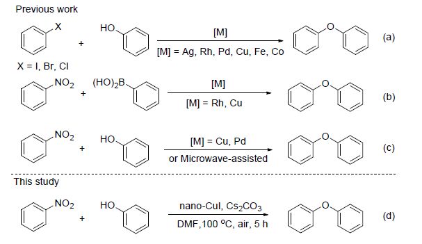A general and efficient method for the synthesis of diaryl ethers via nano-CuI catalyzed coupling reaction of phenols with nitroarenes was developed. The efficiency of this reaction was demonstrated by its compatibility with a range of functional groups in good to excellent yields. The catalyst could be recycled for three times without significant loss of the catalytic activity.