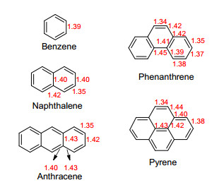 苯及苯的同系物(这里指广义的同系物)属于最经典的全碳芳香化合物.结合晶体数据的键长平均化情况来简要说明(图 10)[84~88], 单晶X射线衍射法表明其共平面性, 并且其键长不属于一般定域的单、双键, 而是相对平均化.在ASE的甲基-亚甲基法下, 苯环的ASE=33.2 kcal/mol, 萘为52 kcal/mol左右(多种构筑方式), 均显示其具有较高的芳香稳定化能[62].