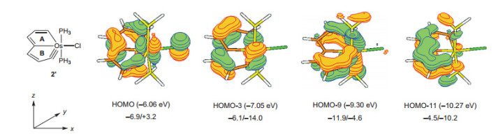 图 25 金属杂戊搭炔的π分子轨道(图下数值分别对应A和B环的NICS(0)zz)