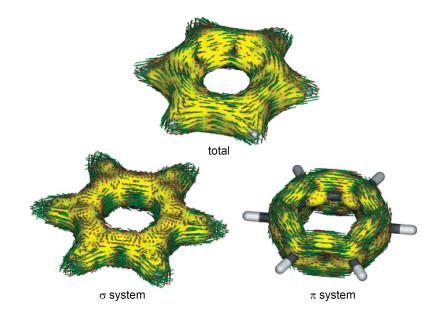 Figure 7 "Left-hand rule" (up); a local current density of hydrogen atom and a delocalized one of benzene (down)