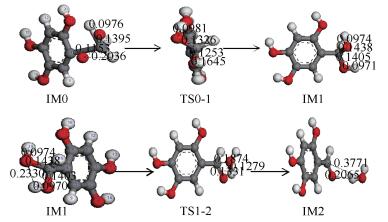 图 11为分子C6H2(OH)3CH3甲基上的两个氢原子先被氧原子氧化成羟基后脱水形成醛基过程中键长的变化。由于出现两个氧原子这里对原子进行编号标记。从IM0看到13、14号氧原子分别靠近10号碳原子,当O14靠近C10时,其对H19产生的牵引作用使得H19与C10之间的碳氢键变长作用力减弱。当O14与H19距离由0.2036 nm缩小为0.1645 nm时,H19与C10间的共价键断裂,H19与O14形成共价键。同时O14与C10距离由0.1453 nm缩小到0.1253 nm时,O14与C10开始形成共价键。对于O13而言,当O13与C10、H17靠近过程中,O13与H17间距由0.0976 nm变为0.0981 nm形成共价键。同时O13与C10间距由0.1395 nm缩小为0.1326 nm也形成共价键,该过程共需克服528.406 kJ/mol的反应势垒,然后分子为达到稳定状态,这时O14与C10的键距伸长为0.1405 nm。同理O13与C10键距拉伸到0.1438 nm保持稳定并得到IM1,整个反应过程放热为33.962 kJ/mol。