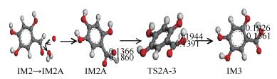 当一个甲基上存在两个羟基时其稳定性变弱,两个羟基容易去掉一个水分子变成醛基。由于两个羟基的属性是相同的,故两个羟基去掉任何一个结果都一样。在此对两羟基重新标记,这里是去掉O17所在的羟基与H20。当IM1所对应的O17与H20相互吸引靠近,其距离从0.2330 nm减小到0.1279 nm时形成共价键,此时O17与C10的距离由0.1438 nm拉伸到0.1874 nm时共价键断裂。O18与H20的距离由0.0971 nm拉伸到共价键断裂,同时O18与C10的距离由0.1405 nm缩小到0.1321 nm时形成双键,该过程需克服137.193kJ/mol的反应势垒。随后小分子开始远离使整个系统处于稳定状态得到IM2,该反应放热25.383 kJ/mol的能量。