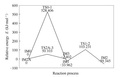 此处,表 1为单个氢原子氧化反应路径过程中反应物、中间体、生成物及过渡态的总能量,过渡态的频率,基元反应的反应能量, 反应势垒及反应速率常数。IM0表示初始反应物,IM1、IM1A、IM2、IM2A表示中间产物,IM3表示最终产物,TS0-1、TS1A-2、TS2A-3表示过渡态。图 10为单个氢原子氧化反应路径的各反应势垒。