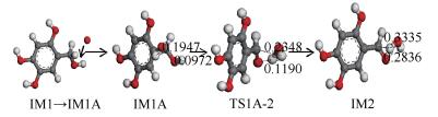图 7为分子C6H2(OH)3CH3甲基上的一个氢原子被氧原子氧化成羟基过程中键长的变化。在IM0中,当单个氧原子靠近甲基上的氢原子时,它对该氢原子产生一种牵引作用,使得氢原子与碳原子之间的键距由0.1097 nm拉长0.1124 nm,碳氢键断裂,表现为氢原子被氧原子牵引而靠近氧原子。同时单个氧原子与游离氢原子距离由0.2341 nm拉近到0.1740 nm时形成羟基。此时羟基不断靠近甲基,当氧原子与碳原子的距离缩为0.1432 nm时最终得到稳定结构IM1。该反应过程需克服2.276 kJ/mol的反应势垒,整体放热量452.010 kJ/mol。