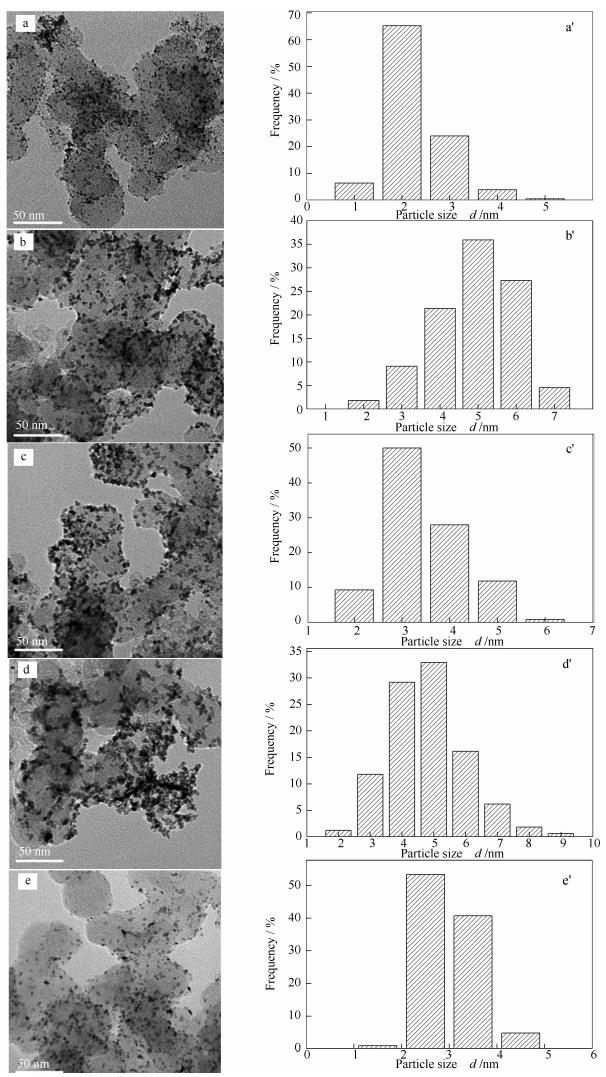 采用X射线衍射(XRD) 和透射电子显微镜(TEM) 对催化剂进行结构、形貌表征。XRD测试表征催化剂的晶相结构,所用仪器为德国布鲁克公司D8 ADVANCE型X射线衍射仪,使用Cu Kα射线源,工作电压为40 kV,工作电流为40 mA,10°-90°扫描,扫描速率为6(°)/min。TEM考察催化剂金属颗粒的粒径和分散情况。所用仪器为日本电子光学公司的JEM-2010透射电子显微镜。加速电压为200 kV,采用铜网微栅样品架,样品在无水乙醇中超声分散,然后负载到样品架上制成电镜样品。