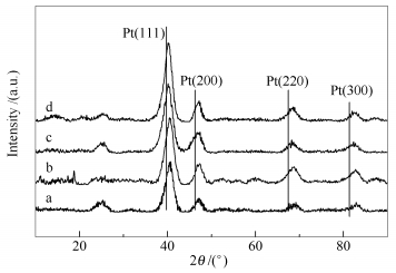 乙二醇还原法具有实验条件简单、原料价廉易得、产物较环保等优点,所以,研究采用乙二醇共还原法制备PtCu/C催化剂[25, 26]。取适量预处理后的XC-72炭黑加入一定量的乙二醇中,超声震荡分散1 h。将一定量的CuSO4(或CuCl2)、CTAB、K2PtCl4(或H2PtCl6) 依次加入乙二醇中,超声分散,然后与分散好的XC-72/乙二醇混合。上述混合溶液在N2气氛保护下升温至140 ℃,冷凝回流搅拌4 h,自然冷却至室温。过滤洗涤,60 ℃下真空干燥10 h。然后在300 ℃,5% H2(N2) 气氛中热处理2 h,制得铜铂总质量分数为20%,铜铂原子比为2:1的PtCu/C催化剂。四种催化剂分别对应编号(a)、(b)、(c)、(d),具体见表 1。