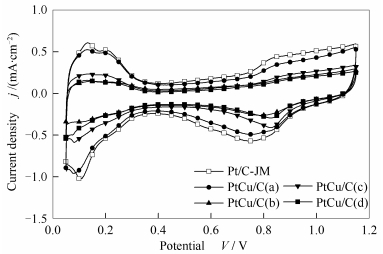图 3为不同前驱体制备的PtCu/C催化剂和Pt/C-JM催化剂的CV曲线。由图 3可知,PtCu/C催化剂的氢、氧吸脱附峰的出现位置相近,氢的吸脱附峰位于0.05-0.25 V (相对于RHE),氧的吸脱附峰位于0.70-0.90 V。通过氢吸脱附峰的面积及催化剂中的Pt含量计算得到不同前驱体制得的PtCu/C催化剂(a)、(b)、(c)、(d) 的ECSA分别为73.0、19.6、39.1、26.4 m2/gPt,为Pt/C-JM催化剂(53.8 m2/gPt) 的1.36、0.36、0.73、0.49倍。CV结果表明,制备的四种PtCu/C催化剂中,采用CuSO4和K2PtCl4作为金属前驱体制备的催化剂(a) ECSA最大,是商业催化剂的1.36倍,这意味着这种催化剂能够为催化反应提供更多的活性位点。结合TEM结果分析,催化剂(a) 的活性组分金属颗粒粒径最小,且在载体上分散最为均匀,活性组分暴露的几何面积最大,因此,具有最大的ECSA,其余三种催化剂金属颗粒较大,出现轻微团聚,所以对应的ECSA略小。