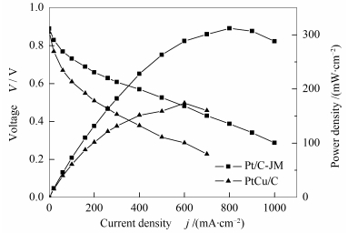 图 5为分别以PtCu/C和Pt/C-JM为阴极催化剂的单电池极化曲线和功率密度曲线。