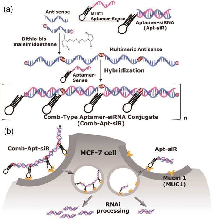 MUC1通常在恶性腺癌(adenocarcinomas)细胞表面过表达,Yoo等[69]将靶向MUC1的DNA核酸适配体连接siRNA正义链,将两端均有巯基修饰的单条siRNA反义链采用化学交联剂DTME连接成线性siRNA多聚物,通过siRNA的正义链与反义链间的碱基互补配对,首次设计出一种多价、具有梳状结构的Comb-Apt-siR复合物(图 2)。该复合物仅包含功能性siRNA和DNA核酸适配体,大大降低了由外源性核酸引起的非特异性免疫。研究结果表明,该复合物不仅特异性靶向MUC1过表达的癌细胞,如MCF-7、A549等细胞,而且梳状多齿结构能同时和细胞膜上的MUC1蛋白结合,增加了Comb-Apt-siR复合物与靶细胞间的亲和力,提高了靶细胞对梳状复合物的吸收(通过细胞内吞),有效输运siRNA到细胞质中并沉默靶标mRNA,抑制肿瘤细胞增殖,且不会对机体产生任何毒性。