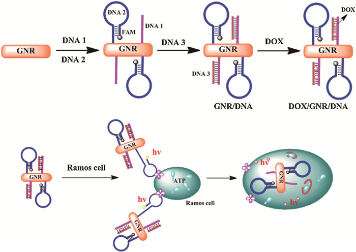 Guo等[73]构建了一种基于金纳米棒的双重核酸适体探针平台,用于肿瘤的靶向治疗。为实现这一平台对靶细胞的特异性识别,他们将一端带有FAM荧光团修饰的Romas-核酸适配体(DNA2) 连接到金纳米棒(GNRs)表面,赋予其靶向Romas细胞的能力。当核酸适体构象改变时,荧光信号会随之被猝灭或恢复,因而可用作刺激响应性细胞传感器。与此同时,将富含GC序列的三磷酸腺苷(ATP)-核酸适配体(DNA1) 也修饰在GNRs表面,由于ATP-核酸适配体为DNA双链结构,可有效提高DOX的装载量。这一平台不仅能特异性靶向Romas细胞并进入靶细胞内部,还能有效检测细胞内的ATP分子,当核酸适配体与ATP特异性结合后释放出药物分子Dox,进一步控制药物的精准释放,抑制肿瘤的生长。