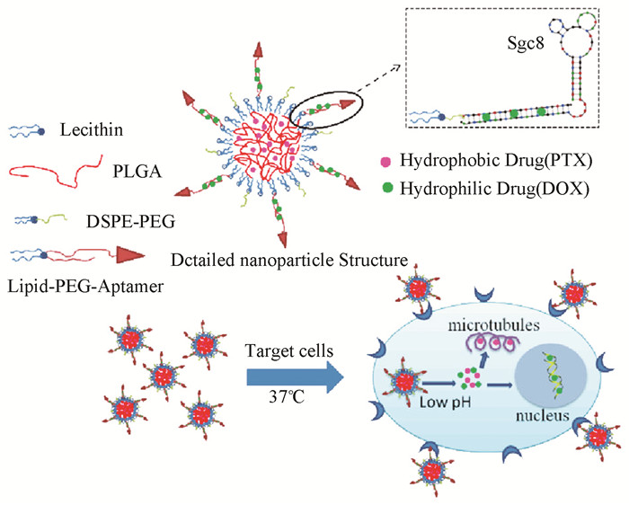 Huang等[89]基于聚合物-脂质体的壳-核结构,构建出核酸适配体sgc8c修饰的PLAG杂化纳米粒子,可同时运输Dox和PTX两种水溶性不同的药物,如图 4所示。实验结果显示,该纳米粒子能被靶细胞CEM细胞选择性摄取,对肿瘤细胞的杀伤作用也大大增强。
