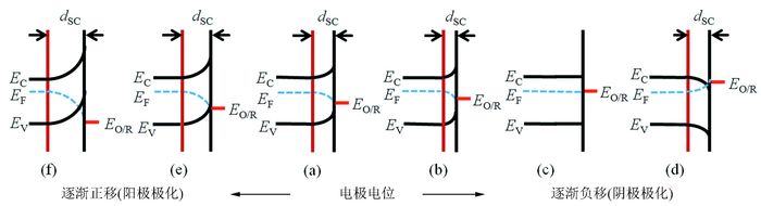 图中分别表示n型半导体耗尽层(a)和外加负电位(b),以及外加负电位达到平带状态(c)和达到积累层能带位置(d),外加正电位(e)耗尽层厚度增大,进一步加大达到反型层(f);dsc表示空间电荷层的厚度;图中显示外加电位时半导体费米能级的变化, EO/R表示电极电位
