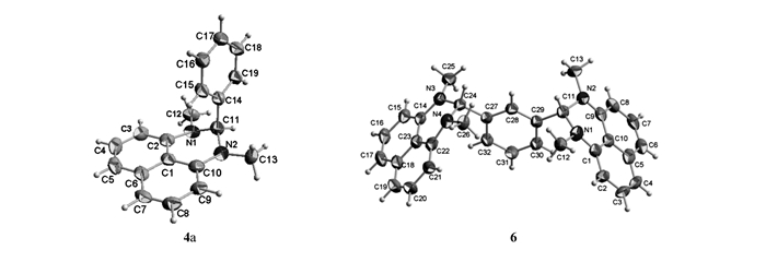 As shown in Table 2, in the structure of compound 4a, the bond angles of N(1)—C(11)—N(2), N(1)—C(11)—C(14) and N(2)—C(11)—C(14) are 109.27(14)°, 112.21(14)° and 114.90(14)° in turn, which indicates the sp3 hybridization state of C(11) atom. The new-formed three-membered heterocyclic ring is not coplanar obviously. Naphthalene and the plane through C(11), N(1), N(2) atoms are inclined 32.181° to each another and the atom C(11) deviates from the naphthalene molecular plane by 0.03120 nm. As a dimer of compound 4a, the compound 6 looks like a letter "M" and C(11) and C(24) atoms in the structure of compound 6 belong to the sp3 hybridization state.