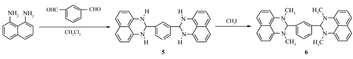 1, 8-Naphthalenediamine(3.72 g, 0.02 mol) and m-phthalaldehyde(0.01 mol) were added to 100 mL dichloromethane, followed by moderate molecular sieves. The mixture was stirred at room temperature for 36 h and monitored by TLC, giving a large amount of white precipitate. After the reaction, the solid was filtered, washed with dichloromethane and dried under vacuum to give the desired product. The product was used in the next reaction without purification.