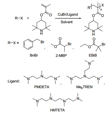 PTMA是通过单体2, 2, 6, 6-四甲基哌啶-4-甲基丙烯酸酯(TMPM)的自由基聚合以及进一步的氧化来制备[8, 9].为了方便合成具有不同分子量或拓扑结构的自由基聚合物, 以及制备含有自由基聚合物的复合材料, 可控自由基聚合是一种重要的合成手段[10~12].与常见的丙烯酸酯类单体相比, TMPM的可控自由基聚合的报道很少.由于其结构中含有仲氨基团, 在通过可逆加成-断裂链转移聚合(RAFT)聚合时, RAFT试剂的硫代酯结构会被氨解从而终止聚合反应, 因此TMPM的RAFT聚合需要事先将氨基转化为相应的盐酸盐[13].而通过原子转移自由基聚合(ATRP)时, 仲氨基团能够取代Cu(I)-配体络合物中的配体, 因此很难取得很好的可控性. Lee等[14]报道了表面引发ATRP制备PTMPM功能化的ITO, 但是没有对其ATRP聚合进行详细的研究. Gohy等[15]报道了TMPM的ATRP聚合, 以TsCl为引发剂, CuCl/dNbpy为催化体系, 得到了窄分散的聚(2, 2, 6, 6-四甲基哌啶-4-甲基丙烯酸酯) (PTMPM), 但是TsCl很难与Grafting-from策略相结合用于合成含有自由基聚合物的复合材料.因此, 在上述工作的基础上, 我们有必要通过对多种引发剂和催化体系的比较, 筛选TMPM合适的ATRP聚合体系.