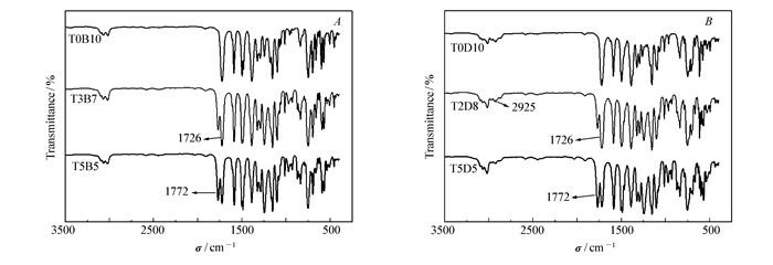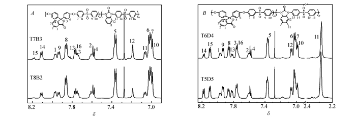 通过红外光谱仪表征了共聚物1和2的结构,如图 1A和1B所示。在3064 cm-1处的伸缩振动吸收峰为苯环上C—H伸缩振动吸收峰,在2926 cm-1处为甲基上C—H伸缩振动吸收峰,在1772 cm-1处为酞侧基上CO伸缩振动吸收峰,在1726 cm-1处为咪唑环上羰基CO伸缩振动吸收峰,在1243 cm-1处为芳醚上C—O—C伸缩振动吸收峰,在1322 cm-1处为OSO伸缩振动吸收峰,二者共聚物都随着HBI、DBI的摩尔分数的增加,在1772 cm-1处的伸缩吸收峰减弱,在1726 cm-1伸缩振动吸收峰增强,与实验的理论结果相符合。