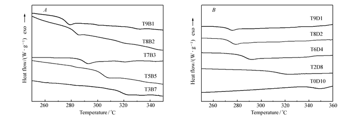 本文制备的共聚物2的TGA曲线如图 5B所示,数据结果如表 3(右)所示,随着DBI的质量分数的增加,共聚物2的Tonset也是升高趋势,但升高幅度不大,引入DBI后共聚物的热分解温度略微降低;随着DBI质量分数的增加,热失重5%时的温度在436~468 ℃之间波动;与均聚物相比,热稳定性有所降低,但均在436 ℃以上,仍具有较好的热稳定性。
