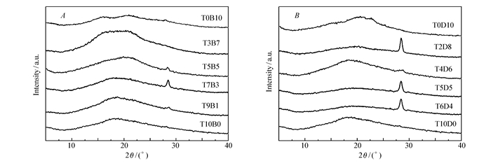 三元共聚物1和2的XRD谱图见图 4A和图 4B,二者的2θ在5°~40°的范围内均出现1个较宽的衍射峰,表明了聚合物为无定形结构,与DSC显示的结果一致。聚合物1和2的共聚物在2θ=28.6°处出现了一个新的衍射峰,强度不大,而均聚物没有。这可能是由于苯并咪唑酮结构刚性较大,导致出现部分单元有序排列导致的。而整个扫描区间则呈现出弥散峰,说明聚合物主链主要为长程无序的聚集态结构。