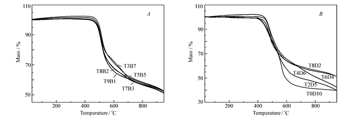 共聚物1和2的DSC二次升温曲线如图 3A和图 3B所示,数据列于表 3。由曲线看出引入第三单体HBI、DBI的三元共聚物1和2只存在单一的台阶,是玻璃化转变而没有熔融转变,为无定型结构。主要原因是分子链中的砜基为立体结构,使聚合物无法熔融结晶,同时砜基赋予分子链较大的刚性;其次酞侧基的存在,聚合物无法形成长程有序的链结构;苯并咪唑酮的引入,阻碍了分子链之间的规整排列。随着苯并咪唑酮质量分数的增加,共聚物1的Tg呈现规律性升高,从270~340 ℃逐渐升高;随着DBI的质量分数增加,共聚物2的Tg呈现升高趋势,从270~344 ℃逐渐升高。影响Tg的变化因素是高分子链内旋转的难易程度。根据理论模拟(引Hay的文献[13]),芳醚基C—O—C的内旋转势垒为2.17 kcal/mol,而C—N—C的内旋转势垒为41.79 kcal/mol,随着共聚物中苯并咪唑酮结构含量增加,C—N—C键所占比重增大,高分子链的内旋转势垒提高,从而使共聚物的刚性增加;而共聚物结构单元中苯并咪唑酮刚性结构的空间位阻也能够显著地增加聚合物的Tg。因此,在聚芳醚砜主链中引入苯并咪唑酮结构,增强了聚合物主链的刚性,从而提升聚合物的耐热性。引入苯并咪唑酮结构后分子主链间的作用力增强也对共聚物Tg的提高有一定的贡献,随着HBI和DBI的质量分数增加,Tg逐渐升高,改善效果显著。当HBI加入的质量分数为14.0%(T5B5) 时,Tg提高了32 ℃,少量的HBI能大幅度提升聚合物的Tg;当DBI加入的质量分数为12.7%(T6D4) 时,Tg提高了16 ℃。较之加入HBI的共聚物Tg提升幅度偏小,产生这种现象的原因可能是DBI的两个甲基加大了分子链间自由旋转的阻力。