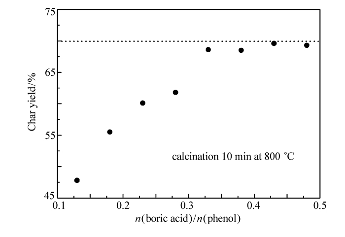 为了进一步研究硼酚醛树脂的反应条件及影响因素,考察了不同硼酸含量对硼酚醛树脂的残炭率的影响。将不同硼含量的树脂样品在800 ℃马弗炉中煅烧10 min,并称量计算其残炭率,如图 2所示。随着硼酸含量增加,硼酚醛树脂的残炭率也在逐渐增加。当n(硼酸):n(苯酚) > 0.33:1时,产物的残炭率开始趋于稳定,无明显的提高。这是由于1个硼酸分子最多可以与3个苯酚分子反应生成硼酸酯,过多加入的硼酸分子并不会以化学键的方式引入到结构中,所以残炭率不会有较为明显的提升。