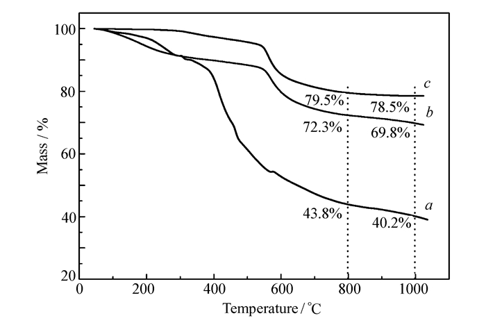 图 3为硼酚醛树脂和普通酚醛树脂的TGA曲线,普通酚醛树脂(图 3谱线a)从200 ℃开始发生明显的失重,并在370 ℃左右失重速率迅速上升,800 ℃时残炭率仅为43.8%,1000 ℃时残炭率为40.2%。