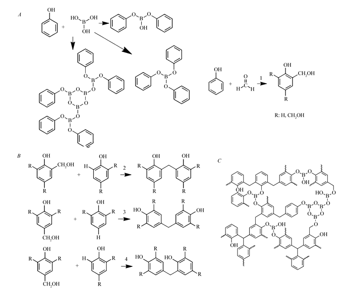 硼酸酯法合成硼酚醛树脂的反应机理如Scheme 1所示:首先,苯酚与硼酸反应生成硼酸苯酯,然后再与多聚甲醛反应生成硼酚醛树脂。Scheme 1A为苯酚与硼酸反应生成硼酸苯酯的几种可能产物,Scheme 1B中反应1为苯酚与甲醛之间的加成反应,生成多种羟甲基酚,即在酚羟基邻位或对位上接枝羟甲基。反应2、反应3以及反应4为羟甲基酚之间的几种缩聚反应,羟甲基酚以这种方式不断进行缩聚反应,使树脂相对分子质量不断增大。Scheme 1C为推测的硼酚醛树脂三维网状结构局部图。