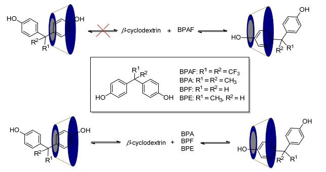 Zhang等[39]将β-环糊精固载到TiO2表面, 构筑纳米吸附材料.研究发现, CDs/TiO2纳米材料比TiO2更具有活性, 能够更有效的降解污染物[40, 41]. Zhang等用该材料对双酚A、双酚E、双酚F和双酚AF进行了降解研究.在未固载环糊精条件下, TiO2对四种环境污染的吸附降解量约为5 μmol/g, 固载了β-环糊精后, 除了对双酚AF的吸附降解率有所下降, 对其他三种污染物的吸附降解率均有明显上升, 分别约为15.7, 21.8, 22.2 μmol/g.之后Zhang等对该吸附降解过程进行了机理研究(Scheme 1).通过二维核磁共振波谱发现, 双酚AF只能通过β-环糊精的下端口进入其空腔内, 而该材料β-环糊精的下端口已经作用于TiO2表面, 因此导致双酚AF无法进入空腔, 也因为TiO2固载环糊精后, 与双酚AF的直接接触面积减少, 导致对双酚AF的吸附降解能力下降.