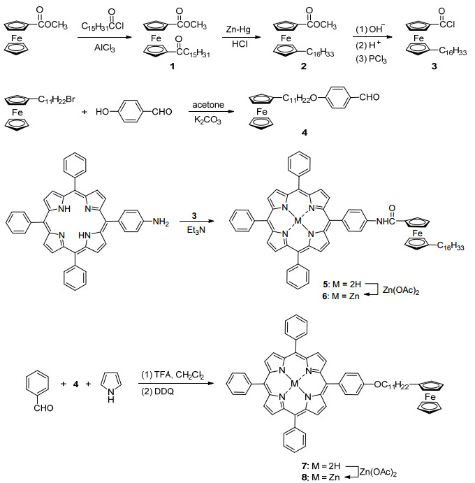 不对称的1, 1'-双取代二茂铁由于容易产生多种异构体, 一般难于合成.如Scheme 1所示, 本文将二茂铁甲酸甲酯与十六酰氯进行富氏酰基化反应, 得到1'-十六酰基二茂铁甲酸甲酯, 随后经锌汞齐还原、皂化、酸化制得1'-十六酰基二茂铁甲酸[19].将1'-十六酰基二茂铁甲酸用三氯化磷处理, 得到酰氯3, 将酰氯3与5-(4-氨基苯基)-10, 15, 20-三苯基卟啉在室温下反应, 得到卟啉5; 将1分子4-(11-二茂铁基十一烷氧基)苯甲醛(4)[20]与3分子苯甲醛和吡咯反应, 制得卟啉7; 将卟啉5与7与醋酸锌反应, 制得相应的金属锌卟啉6与8.在卟啉5与7的核磁共振氢谱中(1H NMR), 由于卟啉环的强屏蔽作用, 中心氮原子上质子的化学位移出现在δ -2.76处, 与金属锌配位后, 该信号消失.此外, 不同的取代方式, 对卟啉中苯环氢的化学位移产生一定的影响, 在卟啉5与6中, 与酰胺基相连苯环邻位质子的化学位移出现在δ 7.90~8.00处, 而在卟啉7与8中, 与氧相连苯环邻位质子的化学位移出现在δ 7.27~7.28处, 这可能由于酰胺基及茂环的进一步去屏蔽作用所致.卟啉中酰胺上质子的化学位移出现在δ 7.63~7.69处, 与氧相连的亚甲基质子化学位移出现在δ 4.24处.在13C NMR中, 卟啉5与6羰基碳的化学位移出现在δ 168.74~168.88处, 而在红外光谱中, 羰基的伸缩振动出现在1640 cm-1附近.高分辨质谱中均出现了卟啉5~8的正离子信号.这些表征确证了新合成卟啉的结构.
