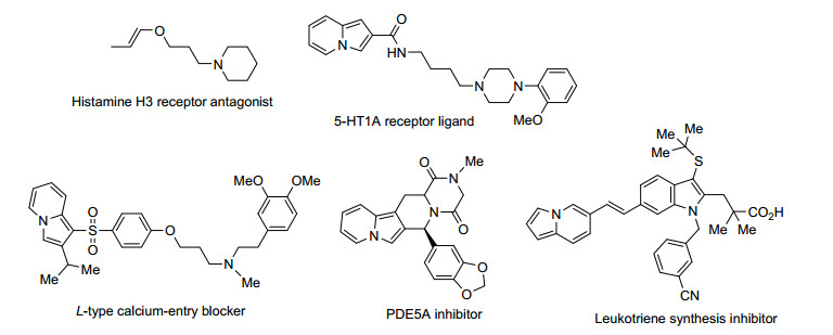 中氮茚骨架构成了一大类生物碱, 很多天然产物或药物也都具有中氮茚结构单元[1].同时, 中氮茚衍生物还被发现具有多种重要的生物活性, 例如:细胞诱变性、致癌性和抗癌性、细胞毒性、抗菌及抗氧化性等[2].中氮茚类化合物普遍具有较高的荧光量子产率和鲜艳的颜色, 目前已有把它们用作颜料、染料和光电材料的报道[3].其中, 3位未取代的中氮茚不仅具有各种生物活性(图 1), 同时因为其3位的电荷密度高, 还是一类重要的合成中间体.被用于合成3-烯基中氮茚、3-芳基中氮茚、3-酰基中氮茚、3-炔基中氮茚、环吖嗪类衍生物及其他杂环化合物[4].
