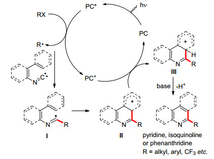 其反应原理如Scheme 1所示, 自由基前体RX被激发态的光催化剂PC还原成自由基R•, 然后加成到异腈上, 生成亚胺(imidoyl)自由基中间体I.随后亚胺自由基I发生均裂芳香取代(homolytic aromatic substitution, HAS), 生成自由基中间体II, 再经过氧化和去质子化, 得到一系列含氮杂环衍生物, 包括吡啶, 异喹啉和菲啶等. R取代基可以是烷基, 芳基或者三氟甲基自由基等[15].
