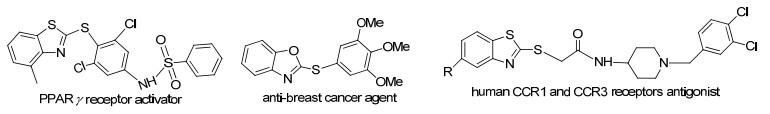 苯并杂环芳硫醚是硫醚类化合物中研究最多、应用最广泛的一类重要有机化合物, 在医药领域中具有重要的药物活性和生理活性, 在新药合成中作为基本单元或中间体被广泛研究[1~4].近年来, 随着生物学的发展, 越来越多的官能化杂环芳基硫醚被不断合成[5], 例如: PPAR γ受体激活剂(PPAR γ receptor activator, 图 1)、抗癌试剂(anti-breastn cancer Agent, 图 1)、人类CCR1和CCR3受体(human CCR1 and CCR3 Receptors antigonist, 图 1).